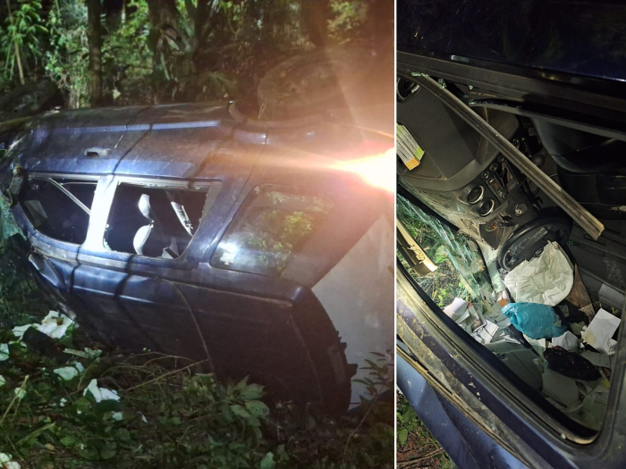 Fotos: Corpo de Bombeiros Um carro colidiu contra um poste, capotou e caiu em uma ribanceira de aproximadamente 15 metros na noite deste domingo (15) na rodovia SC-108, no bairro Travessão, em Braço do Norte. O condutor do Ford EcoSport com placas de São Ludgero precisou ser resgatado por meio de um sistema de cordas.