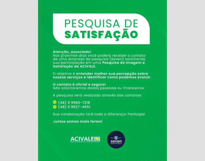 A Acivale iniciará uma Pesquisa de Imagem e Satisfação nos próximos dias e alerta seus associados para estarem atentos. O objetivo é entender melhor a percepção sobre os serviços e identificar como podem evoluir. A empresa de pesquisa Seven fará o contato com os associados. A entidade reforça que o contato é oficial e seguro. Não serão solicitados dados pessoais ou financeiros.