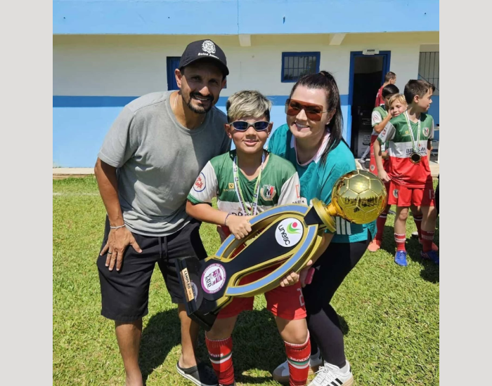 No último final de semana Pedro conquistou o primeiro título no futebol de campo. Atleta da escolinha de futebol do saudoso Maccari, conquistou o seu primeiro título. E para ser mais comemorado, na semifinal, por circunstância da partida, jogou na posição de goleiro e deu conta do recado (não teria dúvida disso). Na final, bom, o título veio para a sua equipe. O que vale nesta idade é se divertir, mas com responsabilidade, e isso Pedro tem de sobra. Parabéns, Pakito e Fran, a foto com esse sorriso no rosto mostra um pouco do quanto vocês lutam em casa para dar o apoio e suporte para ele se tornar um atleta. Em tempo, o nosso atleta atua no sub-10 da ADFT e sub-10 e 11 do Maccari. Haja fôlego, com 10 anos de idade. Sucesso! Voa, meu guri!