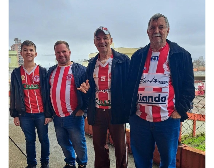 Divulgação/Folha Regional A família Soares nunca escondeu o seu amor pelo Hercílio Luz. Os irmãos Joares e José desde crianças frequentam o Aníbal Torres Costa. No sábado um momento ímpar em família: da esquerda para a direita, o escrete está montado com Hiago Correa Soares, Jeison Douglas Soares, o irmão de Joares, José de Souza Soares, e Joares de Souza Soares, avô de Hiago e pai de Jeison. Além de torcedores, nos jogos fora e em casa acompanham o trabalho do Esporte de Primeira. Jeison chama a família e coloca no telão a nossa transmissão, esperando o “Solta o hino”. Hiago acompanha o pai e sonha, como toda a torcida colorada, com o acesso à terceira divisão do futebol brasileiro.