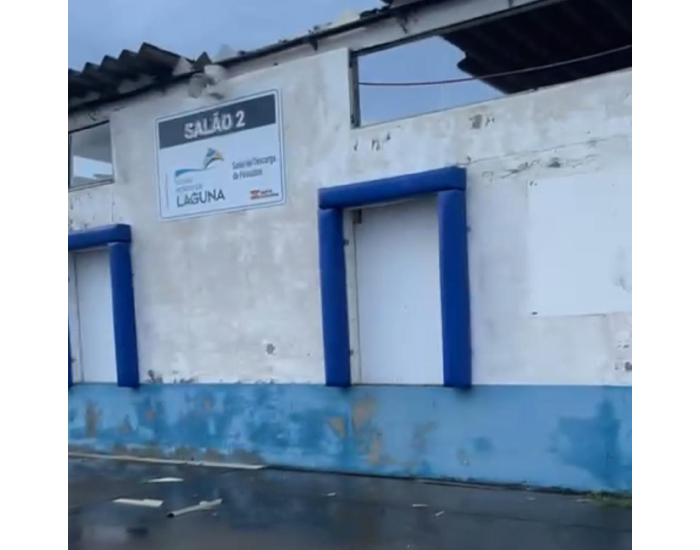 Reprodução/Folha Regional Um vídeo que circula nas redes sociais registra estragos na estrutura do Terminal Pesqueiro de Laguna após o forte temporal que atingiu a cidade e região no final da tarde deste sábado (27). As imagens mostram diversas salas do porto destelhadas.
