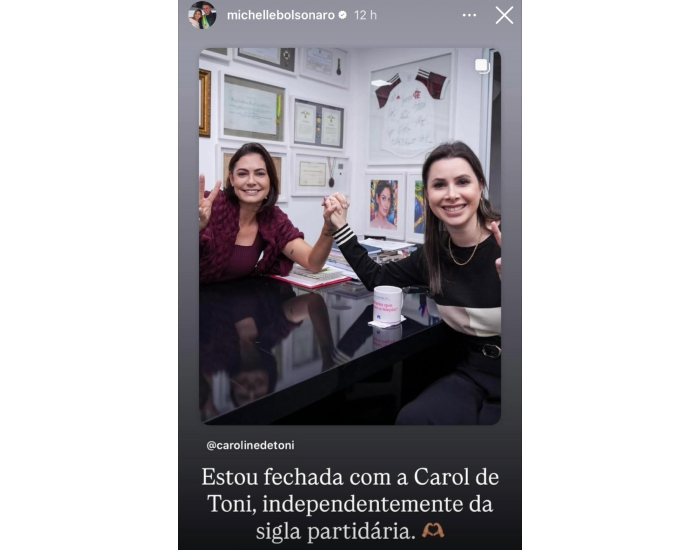 "Estou fechada com a Carol de Toni, independentemente da sigla partidária", disse Michelle em um story, remetendo a um post de maio no qual posou para várias fotos com a deputada federal.
