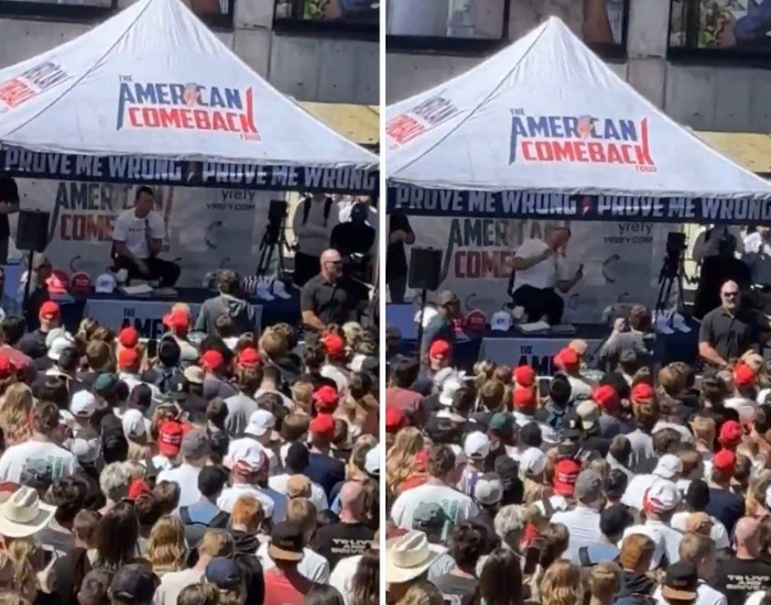 Nas imagens que circulam nas redes sociais, é possível ver o momento em que ele é atingido enquanto discursava sob uma tenda no pátio da universidade.