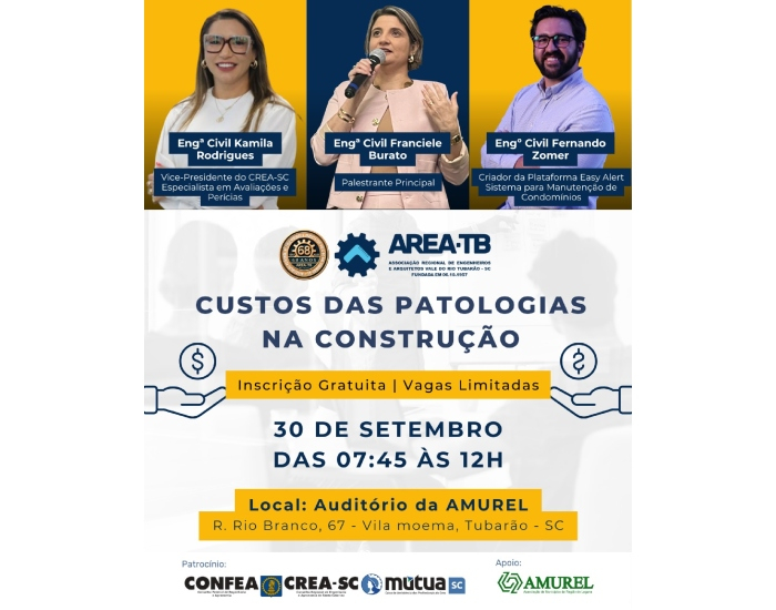 Para compartilhar informações e conhecimento sobre o tema, a Associação Regional de Engenheiros e Arquitetos Vale do Rio Tubarão (AREA-TB), através do patrocínio do Confea, Crea-SC e Mútua-SC e com apoio da Amurel, promove uma palestra gratuita com o tema “O custo das patologias na construção”.