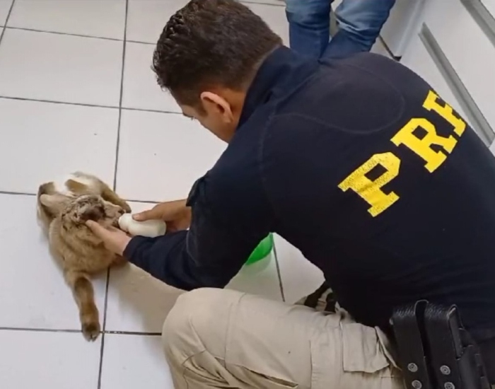O cabrito ainda tinha o cordão umbilical, estava tão fraco que nem conseguia andar, mas não tinha ferimentos aparentes. Os PRFs compraram leite e uma mamadeira para alimentá-lo e, em seguida, o animal começou a reagir.