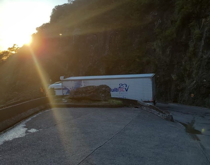 O caminhão está no local aguardando um guincho da própria empresa. O problema no veículo foi no momento em que foi engatada a marcha ré para fazendo a manobra em uma das curvas da Serra.