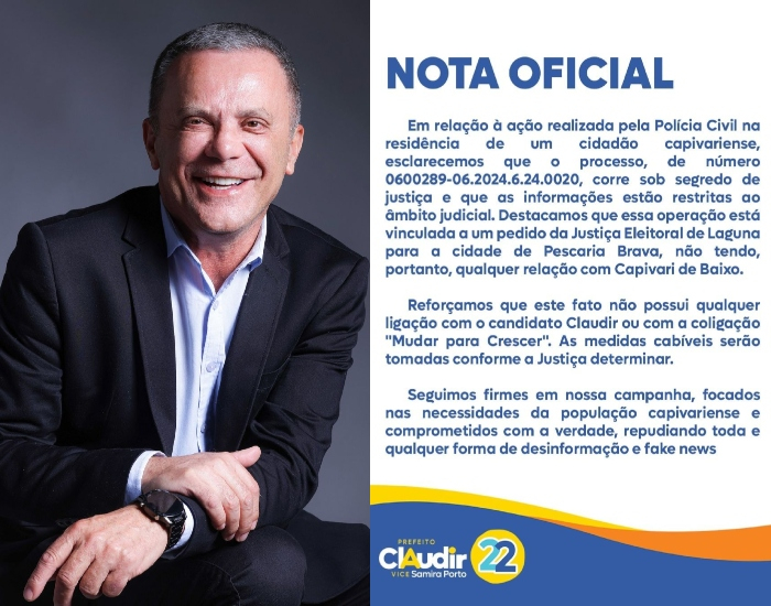 “Destacamos que essa operação está vinculada a um pedido da Justiça Eleitoral de Laguna para a cidade de Pescaria Brava, não tendo, portanto, qualquer relação com Capivari de Baixo. Reforçamos que este fato não possui qualquer ligação com o candidato Claudir ou com a coligação "Mudar para Crescer". As medidas cabíveis serão tomadas conforme a Justiça determinar. Seguimos firmes em nossa campanha, focados nas necessidades da população capivariense e comprometidos com a verdade, repudiando toda e qualquer forma de desinformação e fake news”, diz a nota.
