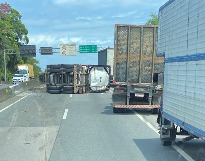 Uma carreta carregada com produto químico tombou na tarde desta terça-feira, dia 19, na BR-101, em Araquari. Por conta do acidente, a rodovia foi totalmente bloqueada, no Km 58, sentido Porto Alegre.