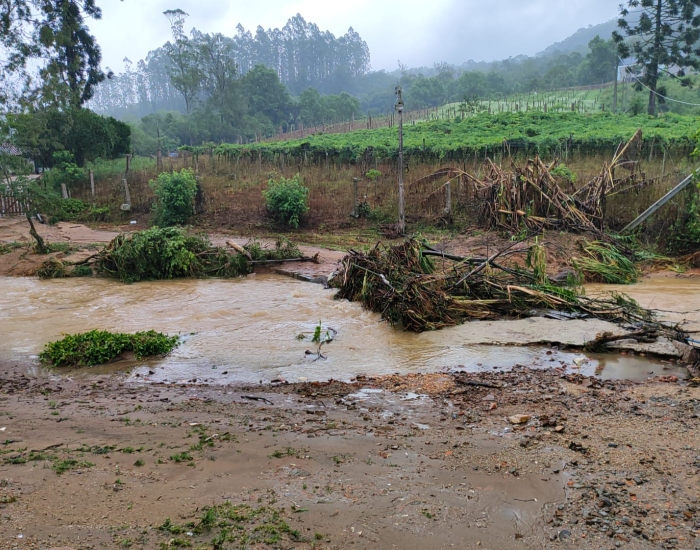 Divulgação/Folha Regional O município de Pedras Grandes soma prejuízos após fortes chuvas que afetaram a região nesta quinta-feira, dia 7. A chuva causou danos em diversas estradas no interior e o transporte escolar teve que ser cancelado. As aulas estão mantidas.