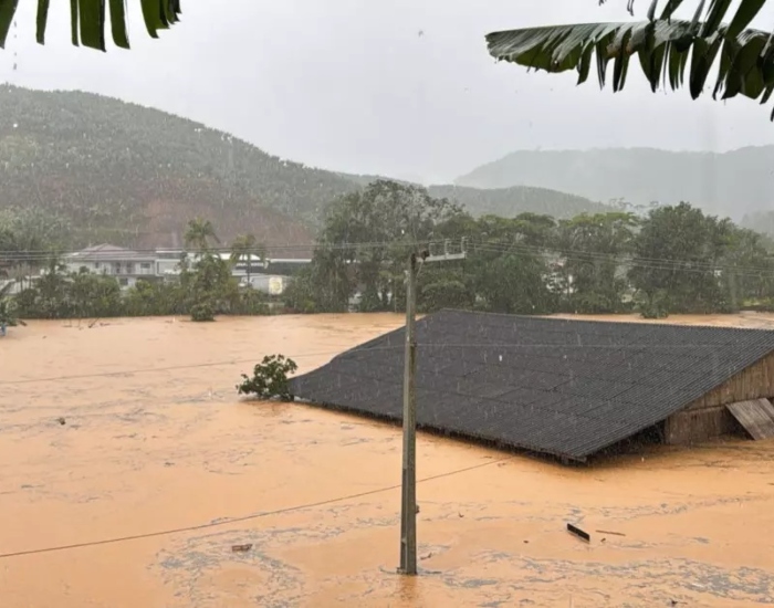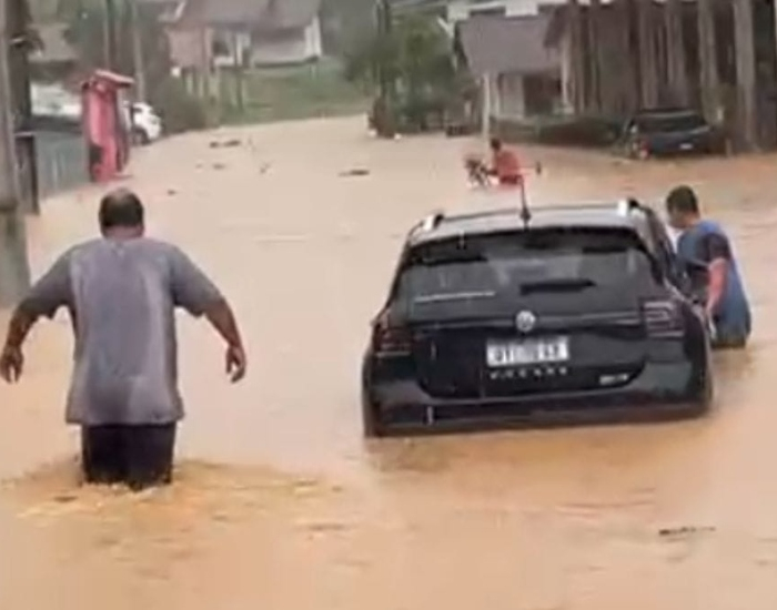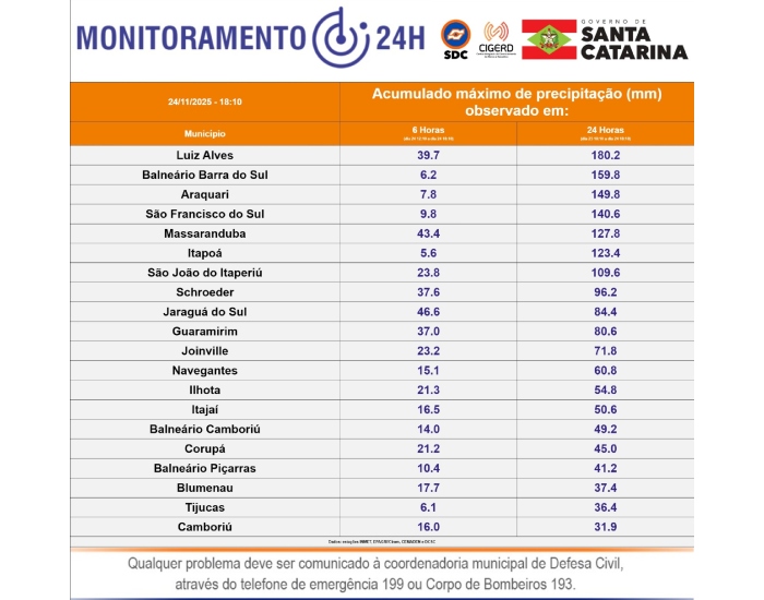 Além de Luiz Alves, Balneário Barra do Sul registrou 159,8 mm de chuva em 24 horas, enquanto Araquari acumulou 149,8 mm no mesmo período.