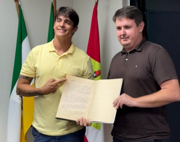 PML/Divulgação/Folha Regional Foi realizada nesta terça-feira, dia 11, a cerimônia de transmissão de cargo do prefeito Preto Crippa ao prefeito interino, Leandro Bento. O vice-prefeito assume interinamente o cargo até o retorno do prefeito, no dia 25 de março, quando retorna da viagem à China.