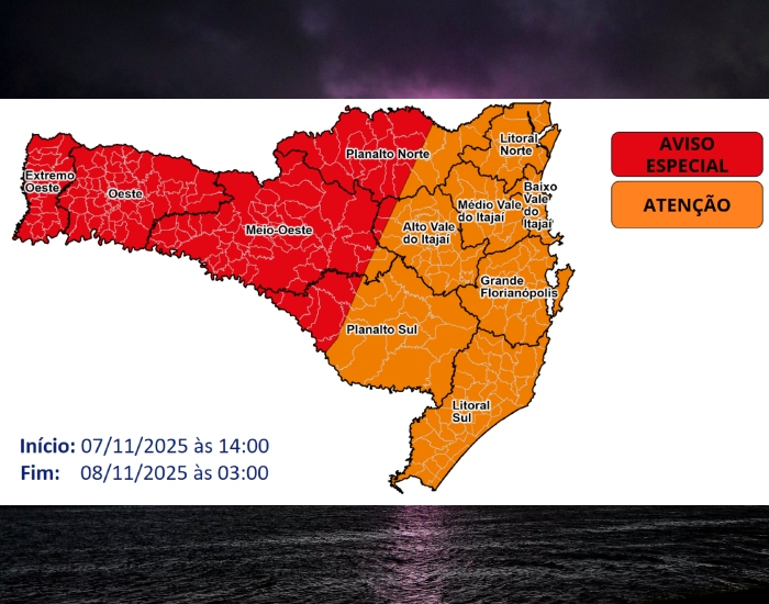 Divulgação/Folha Regional Entre esta sexta-feira, dia 7, e o sábado, dia 8, o processo de formação de um ciclone extratropical em alto-mar, entre a costa do Sul e do Sudeste do Brasil, favorece o desenvolvimento de temporais com vendaval, chuva intensa, raios e queda de granizo em todo o estado de Santa Catarina.