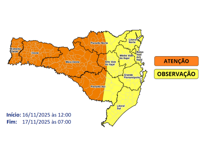 Foto: Divulgação/Defesa Civil A Secretaria de Estado da Proteção e Defesa Civil divulgou um alerta para a incidência de temporais e chuva intenra entre a tarde deste domingo, 16, e a manhã de segunda-feira, 17. As ocorrências estão relacionadas a aproximação e avanço de uma frente fria em Santa Catarina.