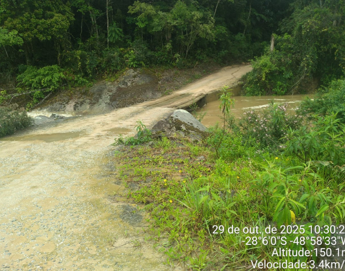 A travessia da rua Alberto Eyng foi isolada preventivamente, enquanto a ponte de acesso ao bairro Rio 7 está sendo monitorada devido ao grande volume de água nas cabeceiras.