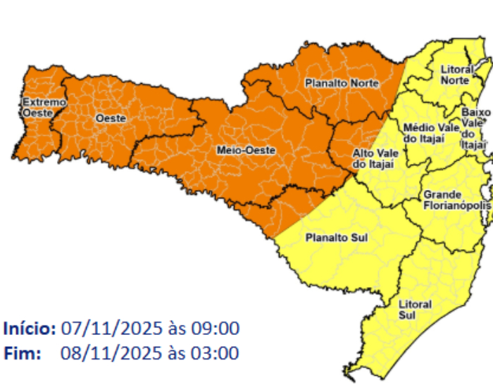 Foto: Divulgação A Secretaria de Proteção e Defesa Civil de Santa Catarina divulgou um alerta para a passagem de um temporal com vendaval e chuva intensa para sexta-feira, 7, e sábado, 8.