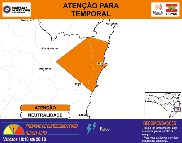 Divulgação/Folha Regional A Defesa Civil emitiu um alerta para temporal com raios, rajados de vento e alagamentos para os municípios de Armazém, Garopaba, Imaruí, Imbituba, Laguna e São Martinho nas próximas 2 horas. A forte chuva também atinge Tubarão e causa transtornos na noite desta sexta-feira.