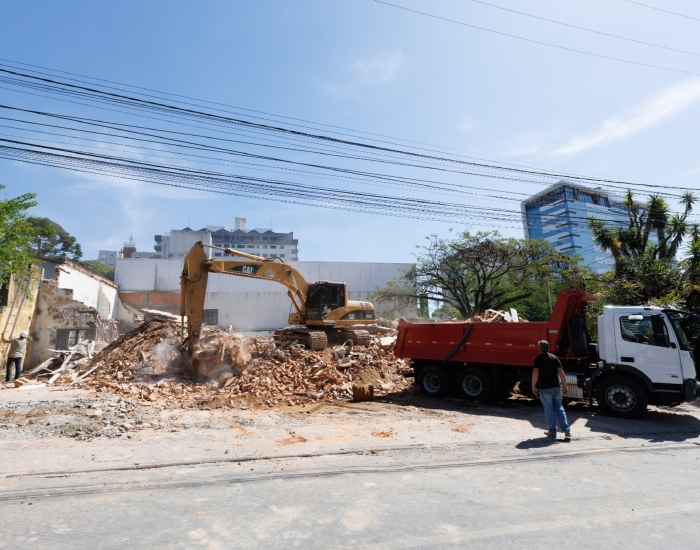 Divulgação/Folha Regional A prefeitura de Tubarão segue com os trabalhos de demolição do prédio da antiga Delegacia de Polícia, no Centro.