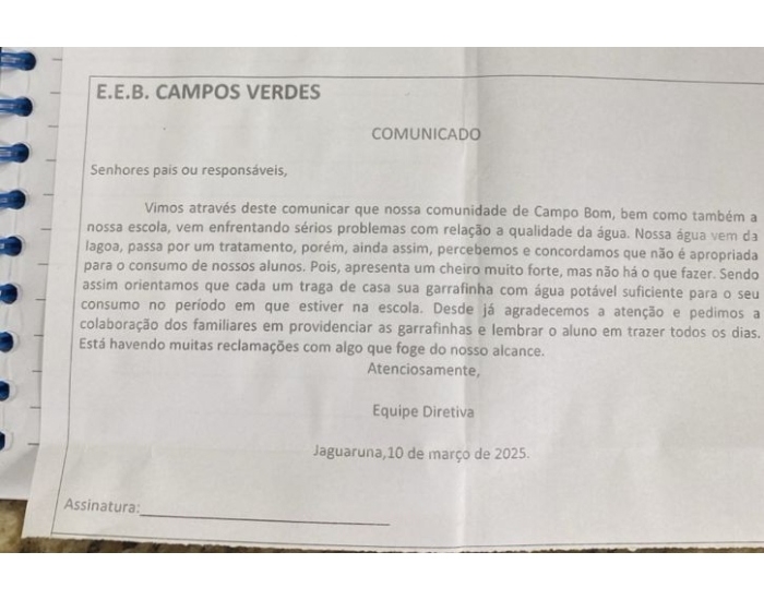 “Vimos através deste comunicar que nossa comunidade de Campo Bom, bem como também a nossa escola vem enfrentando sérios problemas com relação a qualidade da água. Nossa água vem da lagoa, passa por um tratamento, porém, ainda assim, percebemos e concordamos que não é apropriada para o consumo de nossos alunos. Pois apresenta um cheiro muito forte, mas não há o que fazer. Sendo assim, orientamos que cada um traga de casa sua garrafinha com água potável suficiente para o seu consumo no período em que estiver na escola. Desde já agradecemos a atenção e pedimos a colaboração dos familiares em providenciar as garrafinhas e lembrar o aluno em trazer todos os dias. Está havendo muitas reclamações com algo que foge do nosso alcance”, diz o comunicado na íntegra assinado pela equipe diretiva da escola.