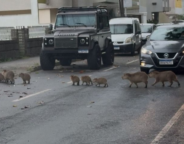 Divulgação/Folha Regional Uma família de capivaras ganhou a atenção dos moradores ao ser flagrada atravessando tranquilamente a avenida Acácio Moreira, na beira-rio de Tubarão nesta terça-feira. O vídeo foi feito pelo jornalista Henrique Fogaça e viralizou nas redes sociais.