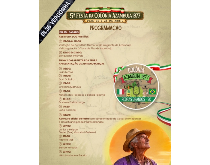 Divulgação/Folha Regional A 5ª Festa da Colônia Azambuja 1877, que ocorre nos dias 25 e 26 de abril em Pedras Grandes, será marcada por um ato inédito de protesto: a exibição da bandeira da Itália com uma tarja preta.