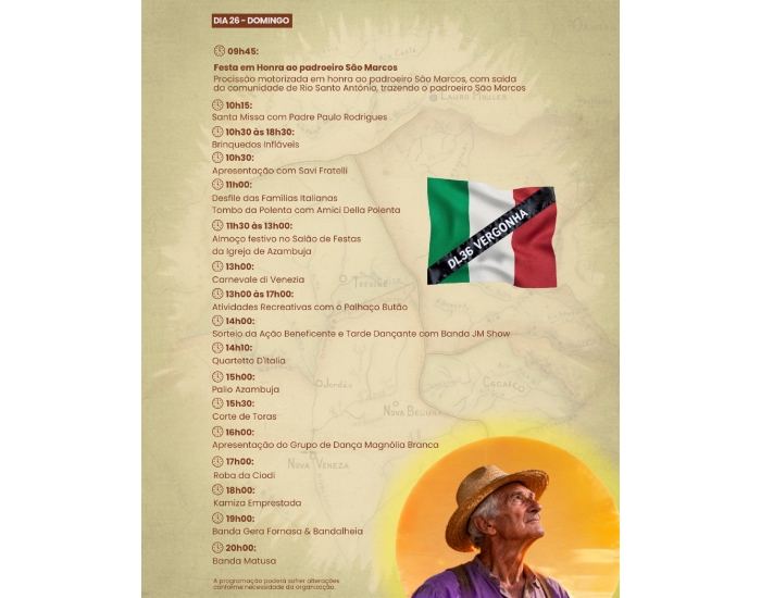 O domingo, dia 26, reserva os momentos de maior conexão religiosa e gastronômica. As celebrações iniciam cedo com uma procissão motorizada em honra a São Marcos, seguida pela Santa Missa. Um dos pontos altos será o desfile das famílias italianas, que representa a chegada histórica dos primeiros imigrantes em 1877.
