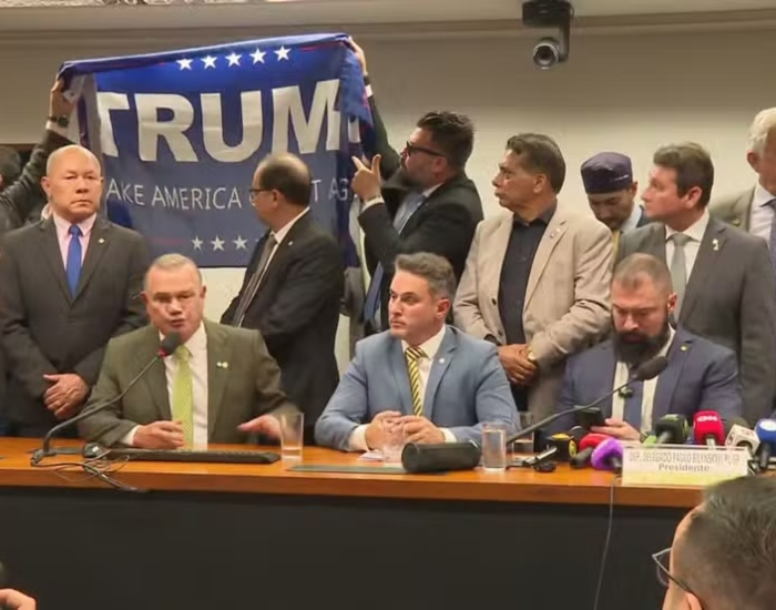 Mesmo diante do impedimento de realizar as comissões, um grupo de parlamentares da Comissão de Segurança Pública se reuniu e exibiu uma placa de moção de apoio em homenagem ao ex-presidente.