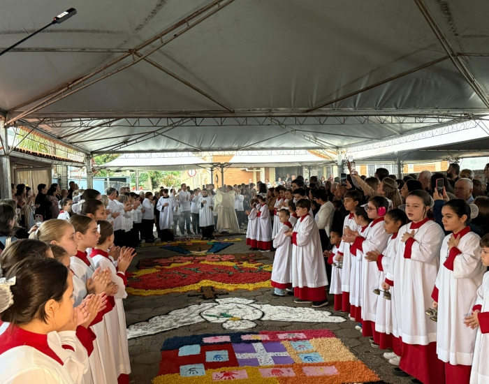 A missa foi celebrada na igreja local e, em seguida, os fiéis seguiram em procissão. Para garantir a realização das festividades mesmo diante das condições climáticas adversas, a comunidade organizou a confecção dos tapetes sob uma estrutura coberta, instalada na rua lateral e na praça da igreja.