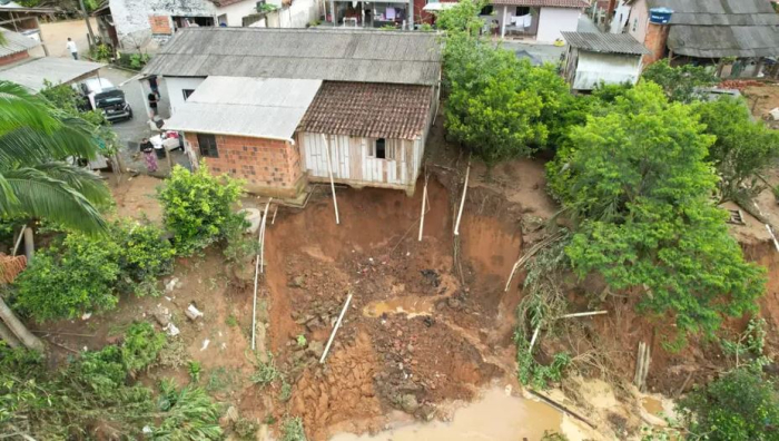 Nos fundos da casa passa um rio. Com a força da enchente, parte da estrutura que sustentava o terreno foi levada embora. A erosão deixou visíveis rachaduras preocupantes, registradas em fotos que passaram a circular na manhã desta terça.