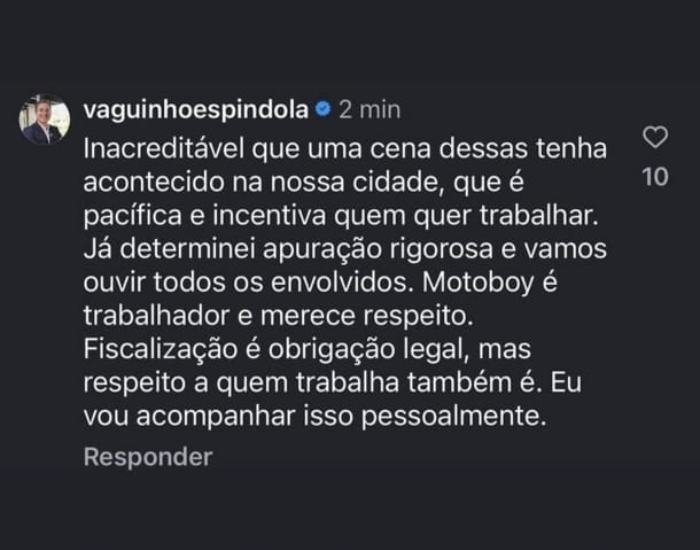 O caso levou o prefeito, Vagner Espíndola (PSD), a determinar a abertura de um Processo Administrativo Disciplinar (PAD) e o afastamento de dois agentes envolvidos. “"Inacreditável que uma cena dessas tenha acontecido na nossa cidade, que é pacífica e incentiva quem quer trabalhar. Já determinei apuração rigorosa e vamos ouvir todos os envolvidos”, comentou o prefeito nas redes sociais.