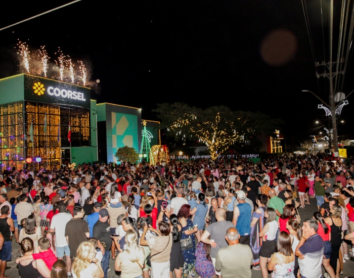 Minutos antes, o presidente da Coorsel, Arilton Francisconi Candido, o Xela, e o vice-presidente, Frederico Francisco Hoepers Preve, o Fred, subiram ao palco para oficializar o acendimento das luzes do Natal Coorsel. A iluminação acompanhada da neve cenográfica arrancou sorrisos e admiração de todos os presentes.