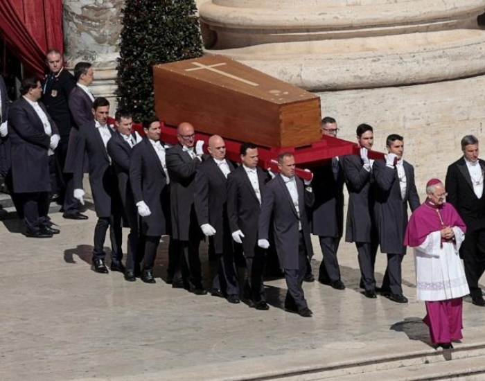 Um Livro dos Evangelhos foi colocado em cima do caixão fechado do papa Francisco que foi carregado pelos Cavalheiros de Sua Santidade – mordomos ou criados do papa. Líderes mundiais comparecem ao funeral