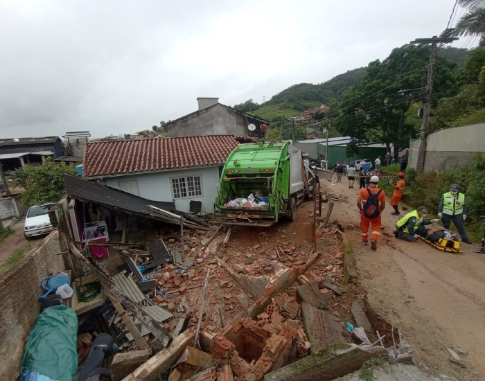CBMSC/Divulgação/Folha Regional O Corpo de Bombeiros constatou que o caminhão de coleta de lixo que destruiu uma residência, perdeu o controle após ficar sem freios em declive. O acidente chamou a atenção dos moradores na tarde desta quinta-feira, dia 30, na Rua Lorival Modesto da Silva, no bairro São Martinho, em Tubarão.