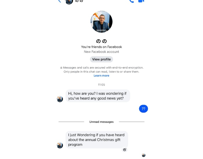 Frases como “Gostaria de saber se você já recebeu alguma notícia boa?” e “Gostaria de saber se você já ouviu falar do programa anual de presentes de Natal” escritas em inglês foram enviadas usando a foto e nome do prefeito.