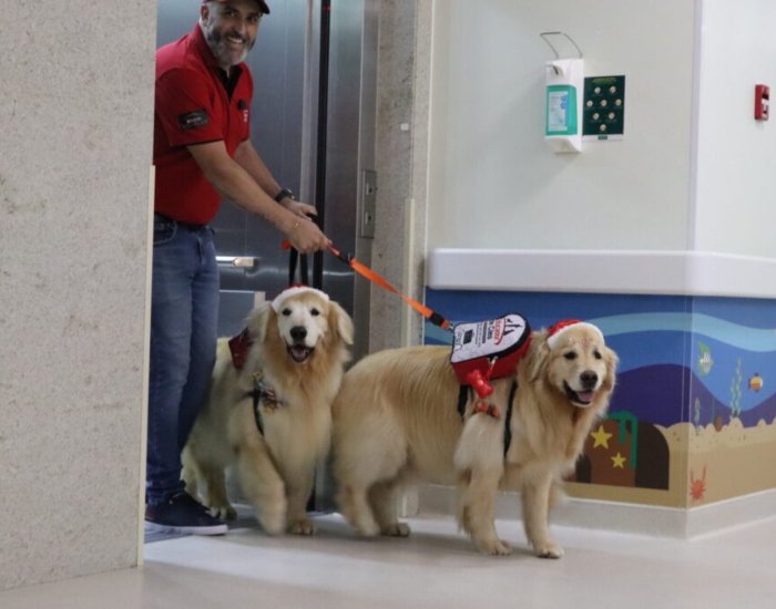 Assim que o elevador parou no terceiro andar da instituição e as portas se abriram, surgiram sorrisos imediatos e um “ouuun” coletivo diante da cena: dois cães terapeutas da raça golden retriever, usando touquinhas de Papai Noel e carregando uma mochilinha cheia de presentes. As crianças já aguardavam no corredor e formaram uma fila, como um túnel de boas-vindas para receber a dupla.