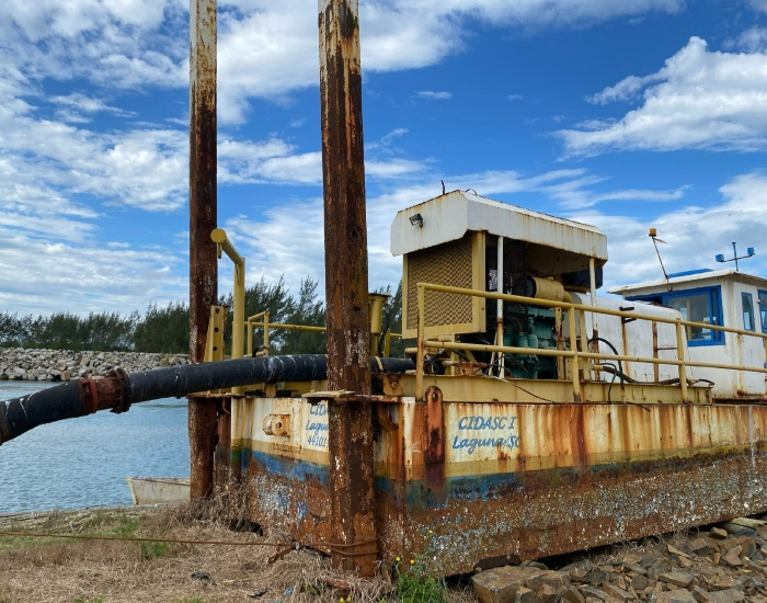 O equipamento foi retirado da água em abril do ano passado e continua inoperante às margens do canal da Barra, em estado de deteriorização.