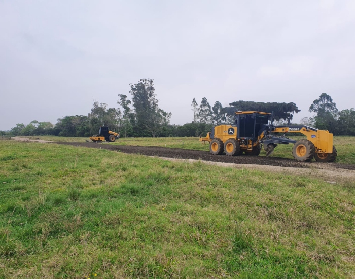 As máquinas no loteamento e a equipe de topografia mostram a dinâmica das obras. Na fase atual, o local está na etapa de receber a sub base para colocação dos meios-fios e após isso, a pavimentação asfáltica.