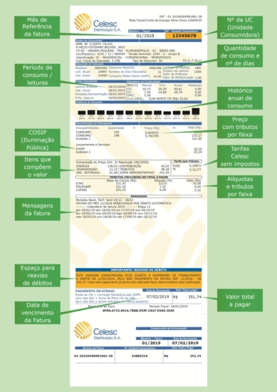 A conta de luz da Celesc informa todos os detalhes de relativos ao consumo e às cobranças feitas ao cliente. Entre os itens que devem ser conferidos estão as datas de leitura (última, atual e próxima programada), o gráfico com histórico de consumo, a especificação das faixas de consumo (a primeira vai até 150 kWh), além de aviso de corte (quando há pagamento em aberto). Confira na arte abaixo onde fica localizada cada informação disponível na fatura de energia: