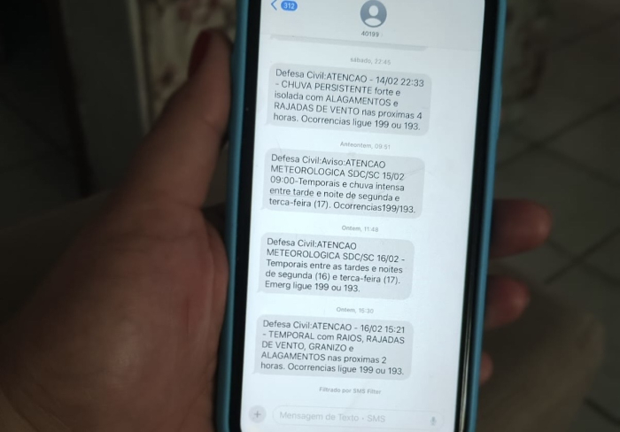 Foto: Priscila Loch Santa Catarina é o estado do Brasil com o maior número de pessoas cadastradas no serviço de alertas por SMS da Defesa Civil. Atualmente, um em cada dez catarinenses (10,54%) recebe avisos antecipados ou alertas de risco iminente de desastres naturais diretamente no celular, por meio de mensagens de texto enviadas pela Secretaria de Estado da Proteção e Defesa Civil.