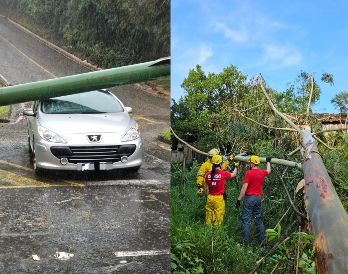 CBMSC/Divulgação/Folha Regional Na tarde desta sexta-feira, dia 28, após temporal com ventos intensos, a equipe do Corpo de Bombeiros Militar em Orleans atendeu diversas ocorrências de queda de árvores sobre residências e auxílio à comunidade.