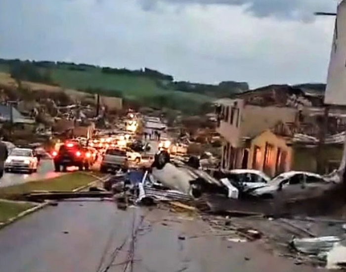 Imagens registradas por moradores mostram casas destelhadas, estruturas colapsadas e postes de energia derrubados pela força do vento. O governador Ratinho Júnior (PSD) afirmou, nesta noite, que o tornado foi classificado como de nível 3, com ventos que podem chegar a mais de 250 km/h.