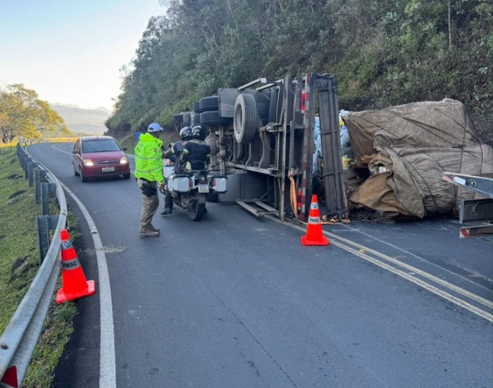 Foto: Divulgação/PMRv Um caminhão tombou na altura do KM-414 da SC-390, na Serra do Rio do Rastro, na manhã deste sábado, 30. A Polícia Militar Rodoviária está atendendo a ocorrência.