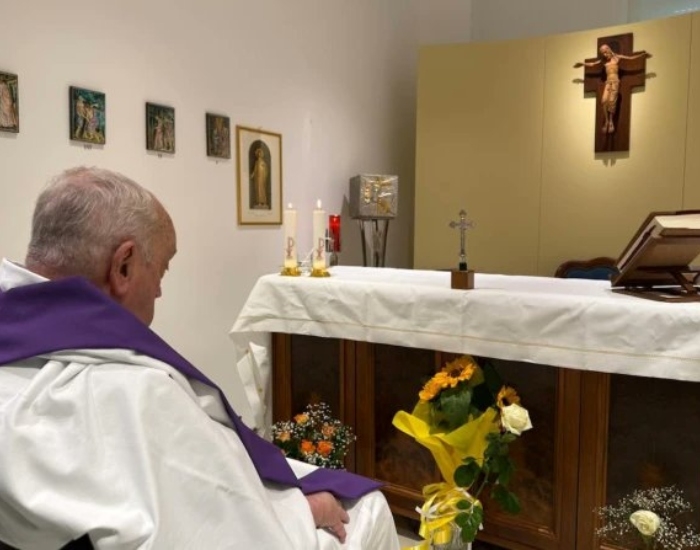 Na imagem, é possível ver o pontífice de perfil sentado no que parece ser uma cadeira de rodas em uma missa na capela do hospital neste domingo, dia 16. Ele aparenta não estar usando auxílio para respirar.