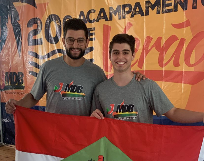 João Vitor à direita - Fotos: Divulgação/Folha Regional João Vitor Nasario dos Santos, de Armazém, vereador mais jovem eleito este ano na Amurel pelo MDB, e outras lideranças do partido participaram nesta fim de semana do 20º Acampamento de Verão da Juventude do MDB do Rio Grande do Sul.