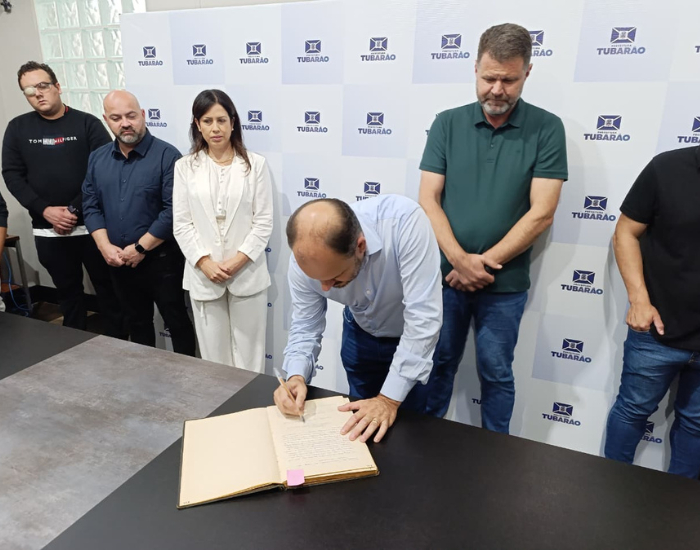 Foto: Divulgação/Folha Regional O presidente da Câmara de Vereadores de Tubarão, Felippe Tessmann (PL), assumiu interinamente a chefia do executivo municipal nesta sexta-feira, 7. A passagem de governo aconteceu em um ato no Paço Municipal.