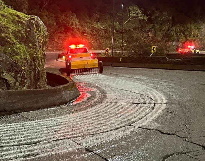 O despejo de sal na pista foi feito no fim da noite de quinta com um equipamento acoplado à viatura da polícia rodoviária. O sal é espalhado nas rodovias para evitar a formação de gelo e reduzir o risco de perda de aderência dos pneus e derrapagens.