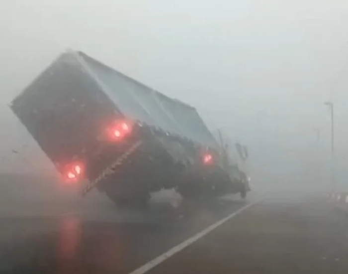 Divulgação/Folha Regional A aproximação de uma frente fria provocou um forte temporal no fim da tarde desta segunda-feira, dia 31, em Porto Alegre, no Rio Grande do Sul. A força do vento chegou a derrubar um caminhão que passava pela ponte do Guaíba, que liga a capital do RS à Região Metropolitana. O momento foi gravado por um motorista que passava no momento do acidente.