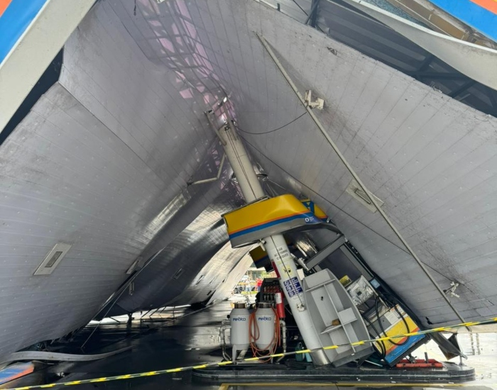 As fortes chuvas com rajadas de vento registradas nesta terça-feira, dia 5, causaram prejuízos após a estrutura de um posto de combustível desabar.