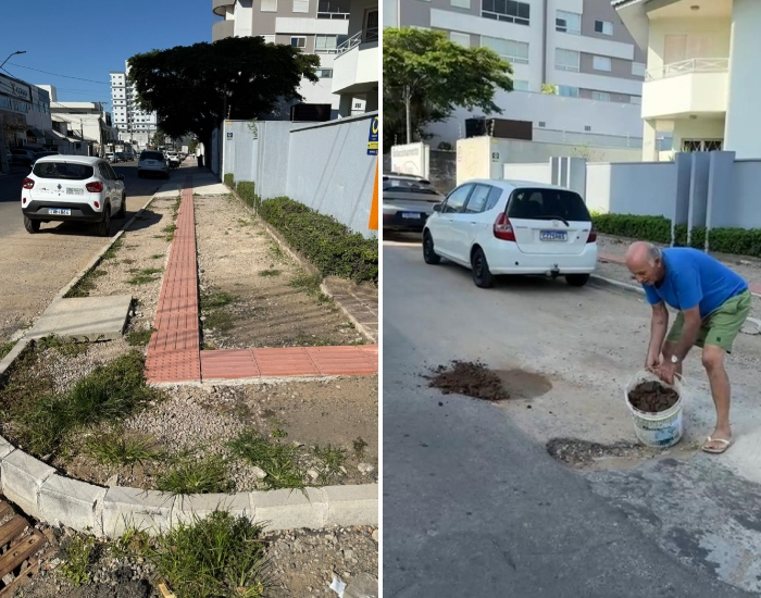 “Um idoso caiu e se machucou e uma mãe não conseguiu passar com o carrinho de bebê e teve que passar pela pista. Está causando bastante transtorno, além da questão estética. A empresa arrancou a nossa calçada e até agora não finalizou a obra”, diz o empresário Leandro Amaro, que é proprietário de um estabelecimento comercial na referida via.