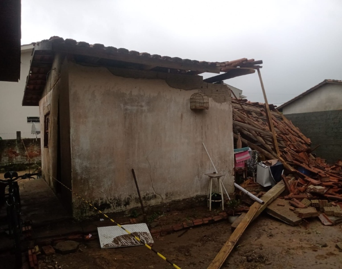 Duas residências foram isoladas por terem suas estruturas atingidas pela força da água. A primeira ocorrência foi registrada no Centro de Jaguaruna.