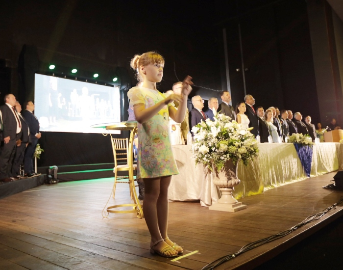 A pequena Sophie Warmling Machado, de 7 anos, foi um dos destaques da cerimônia de posse dos eleitos na Arena Multiuso, em Tubarão, no último dia 1º de janeiro.